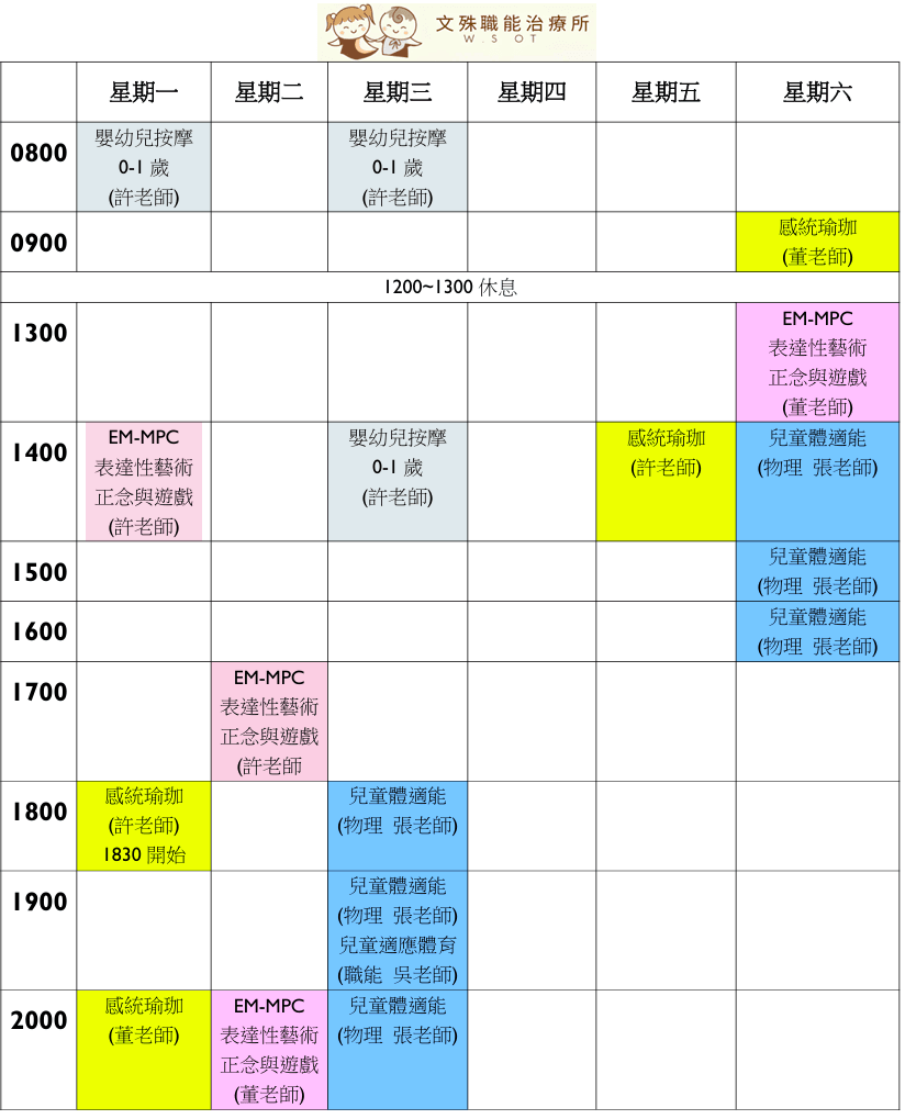 兒童感統瑜珈、嬰幼兒按摩、兒童體適能、表達性藝術課程表